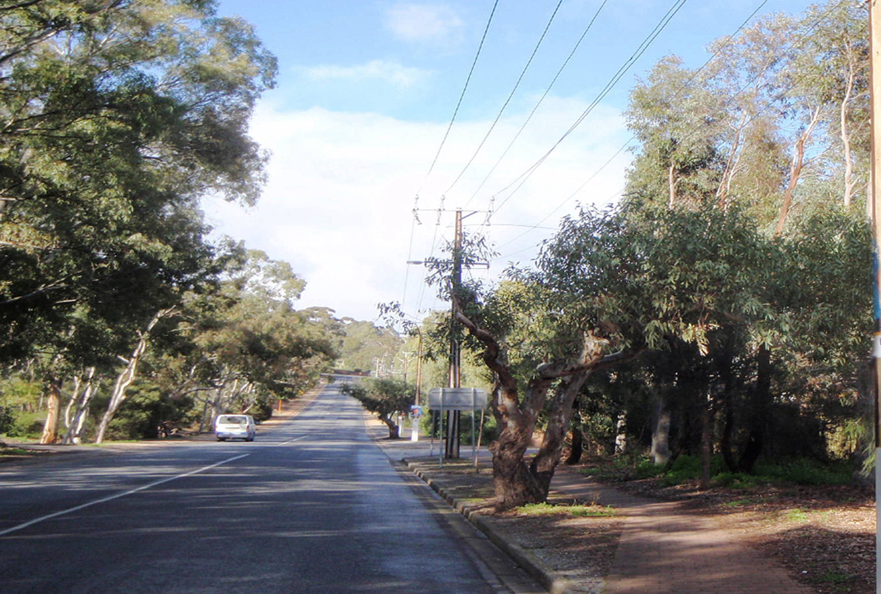 ETSA had its own solution which is still evident today – either cut down the trees or massively prune them. A stark illustration of this heavy-handed approach is offered just across Morialta’s border with Campbelltown, where native trees along Stradbroke Road opposite the lower car park of the Morialta Conservation Park (pictured below right), are routinely pollarded and pruned to keep them clear of power lines.